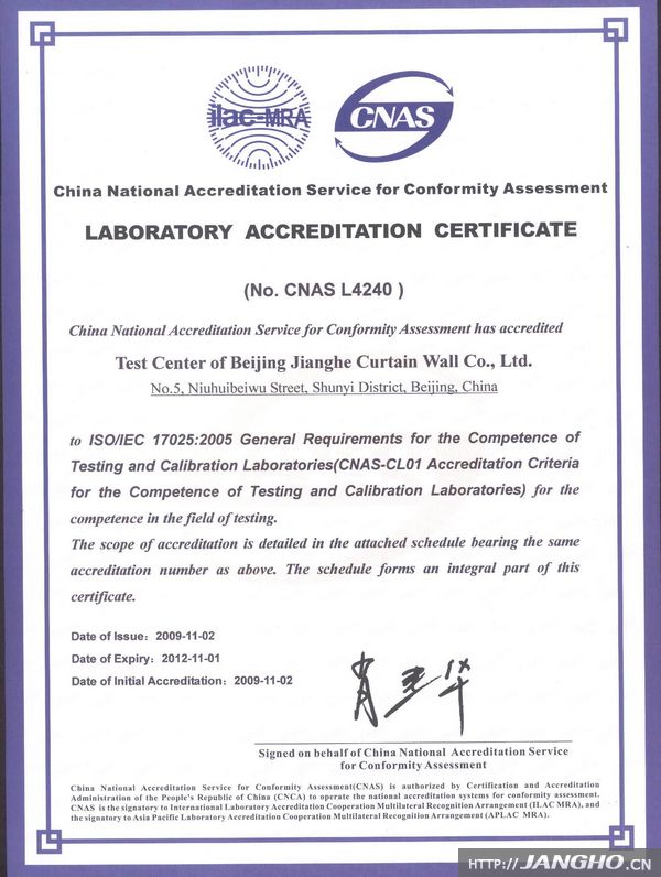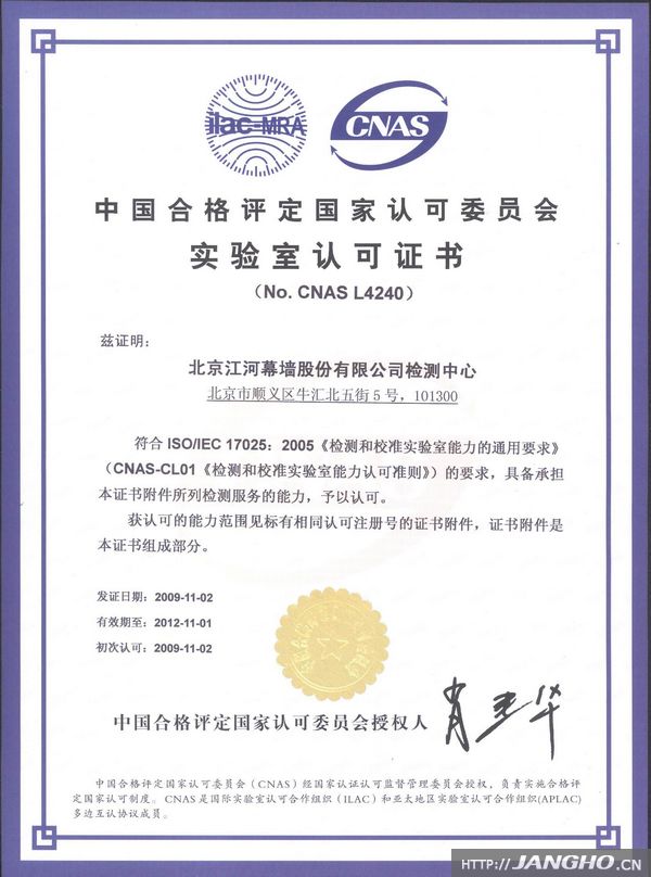 江河幕墻檢測(cè)中心正式獲得CNAS實(shí)驗(yàn)室資質(zhì)認(rèn)可證書(shū)——成為行業(yè)首家通過(guò)評(píng)審并列入國(guó)家獲準(zhǔn)實(shí)驗(yàn)室認(rèn)可機(jī)構(gòu)名錄的幕墻企業(yè)